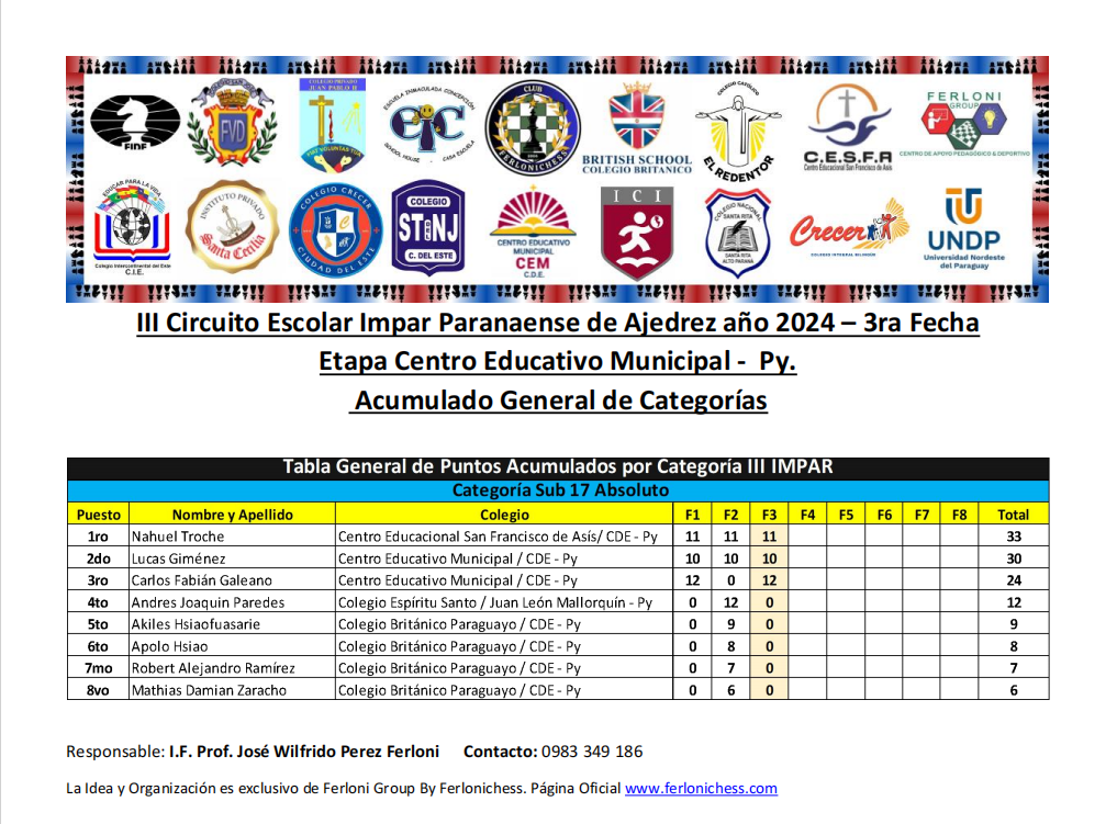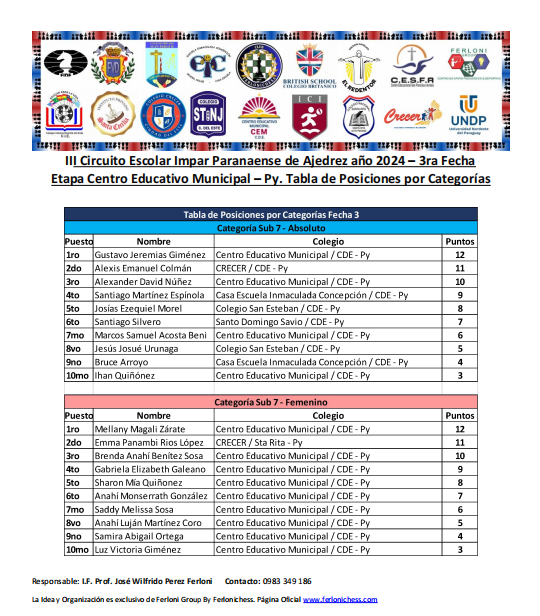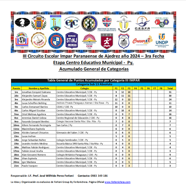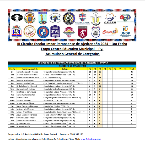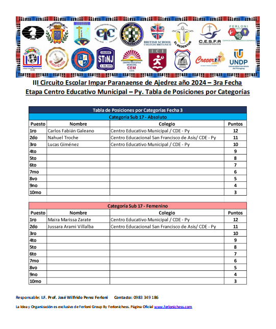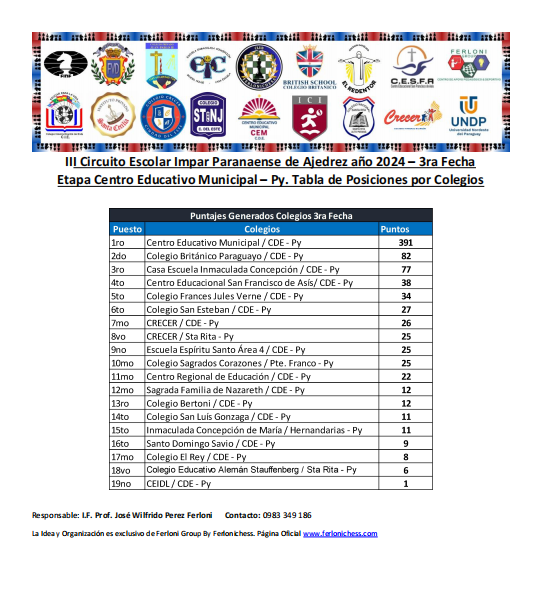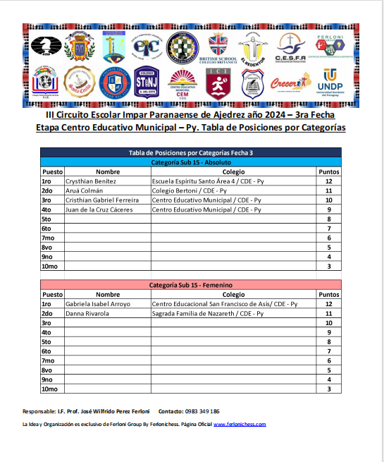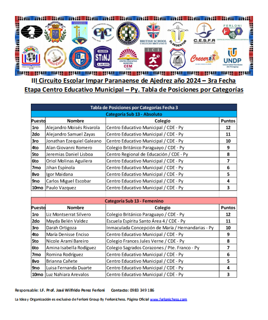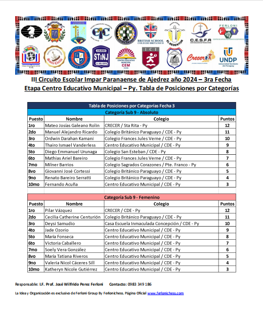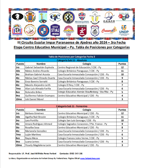 Tabla de Posiciones de Categorías y Colegios 3ra Fecha