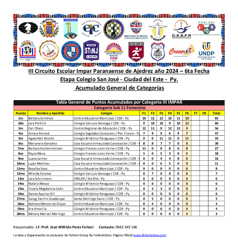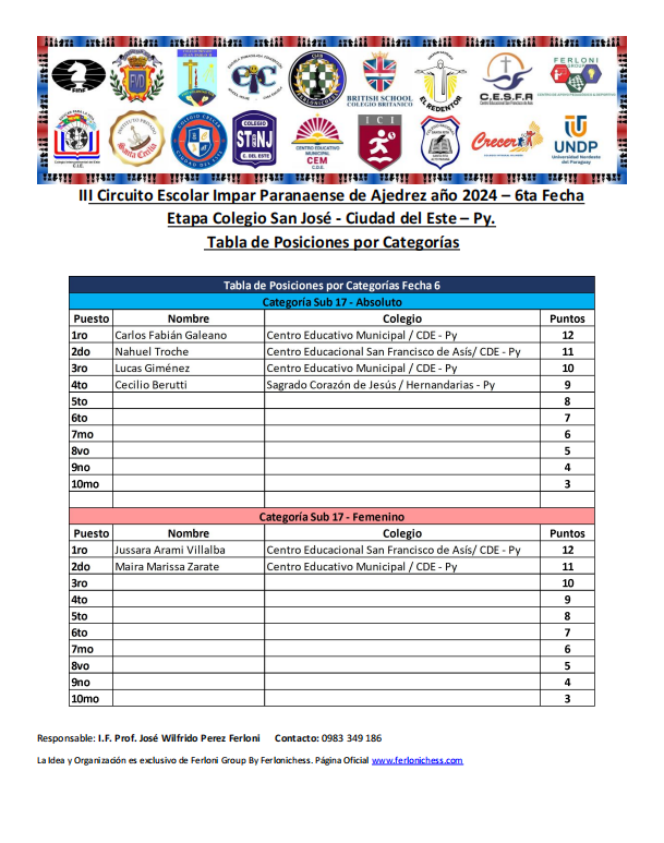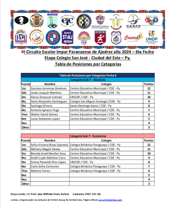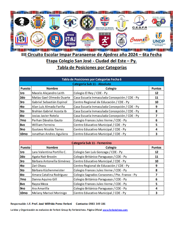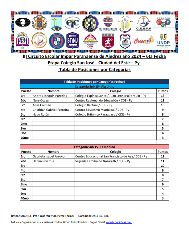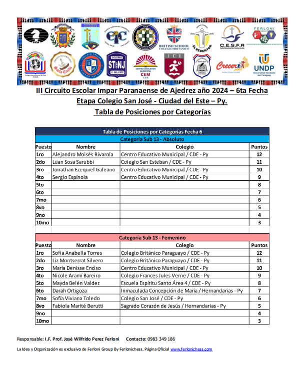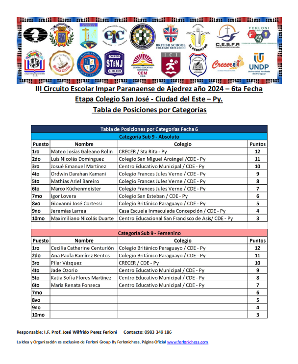 Tabla de Posiciones de Categorías y Colegios ​6ta Fecha