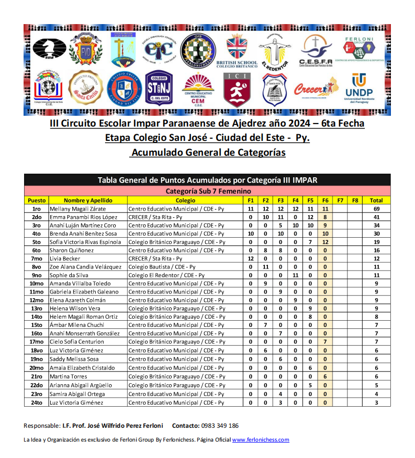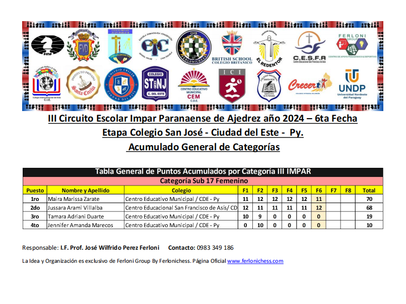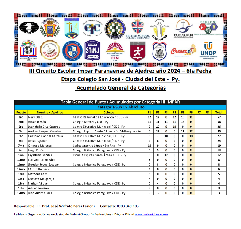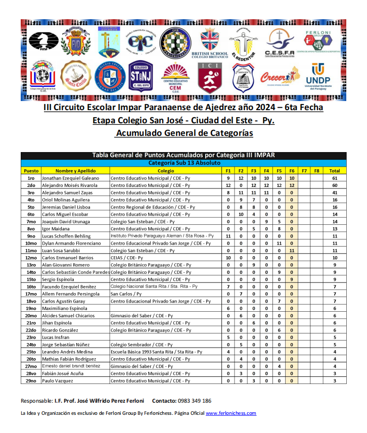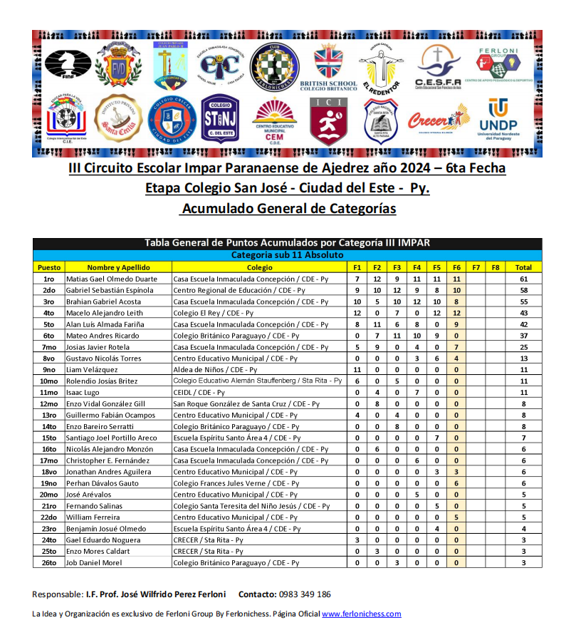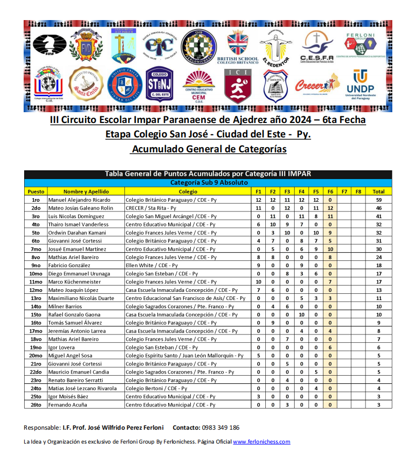 Tabla de Posiciones de Categorías y Colegios ​6ta Fecha