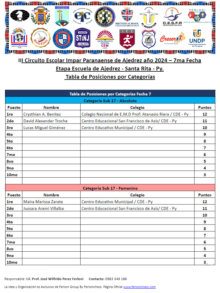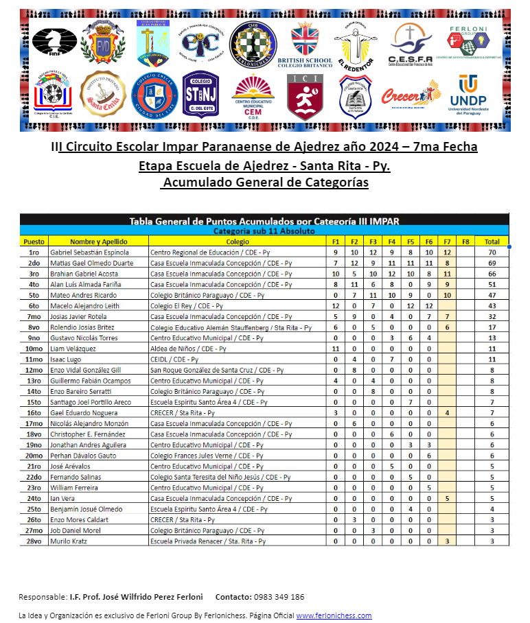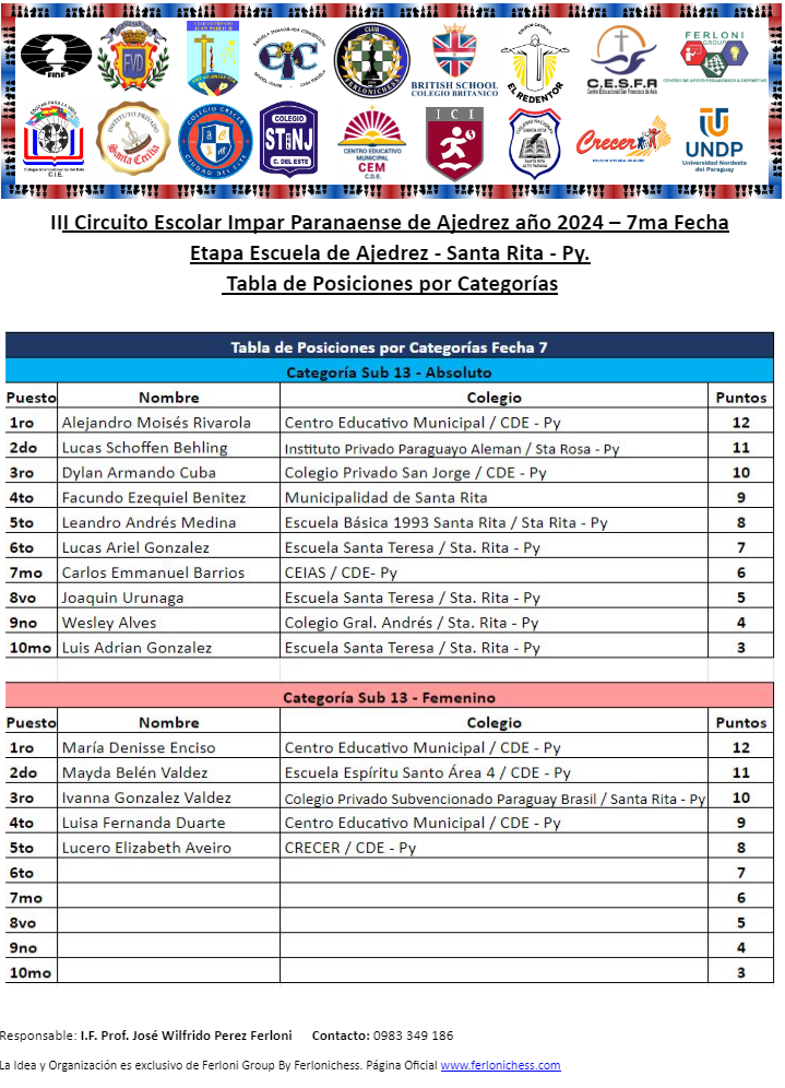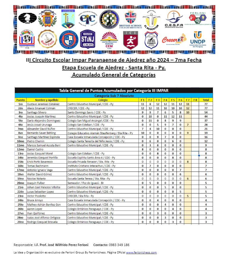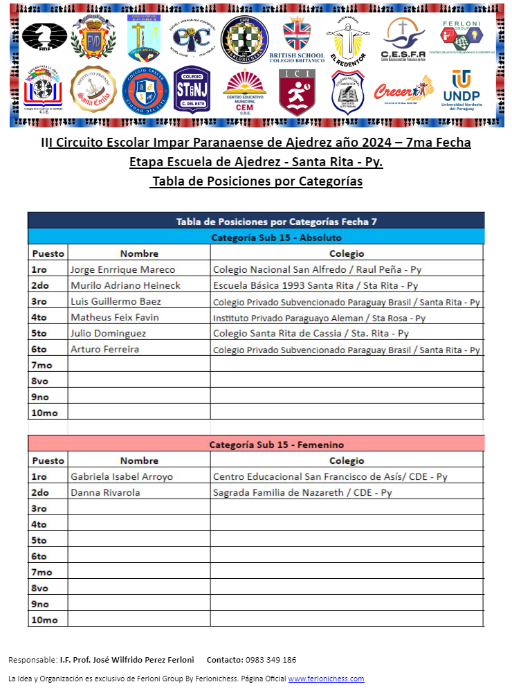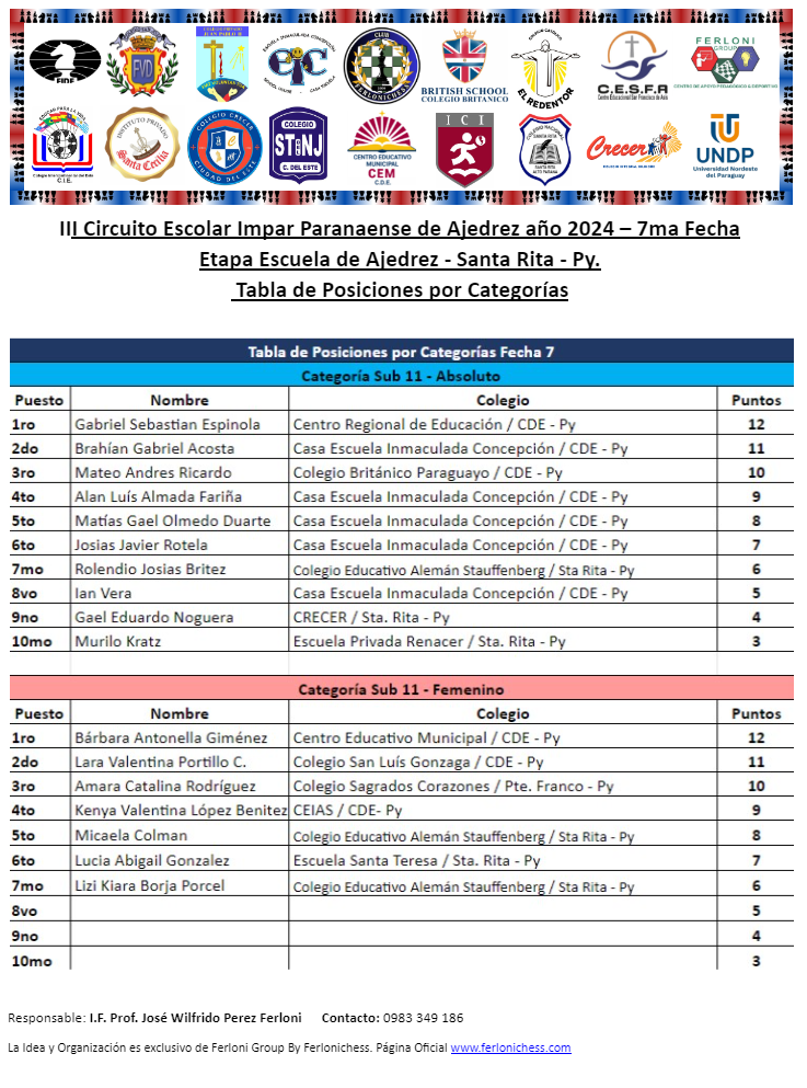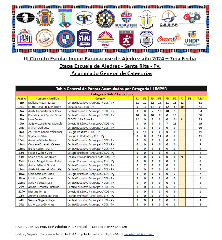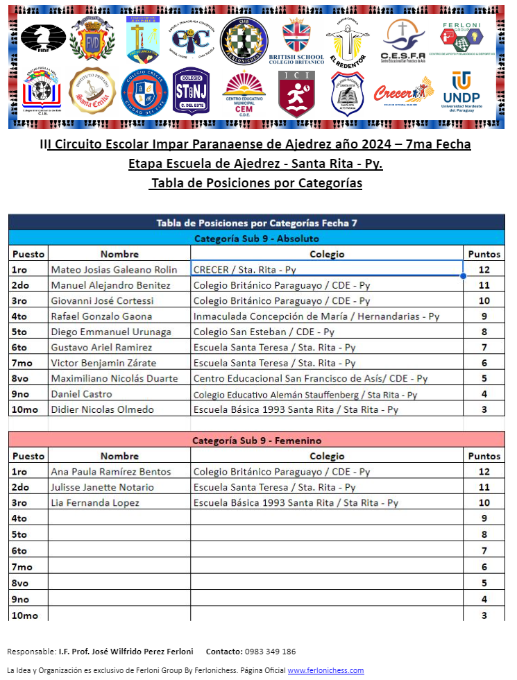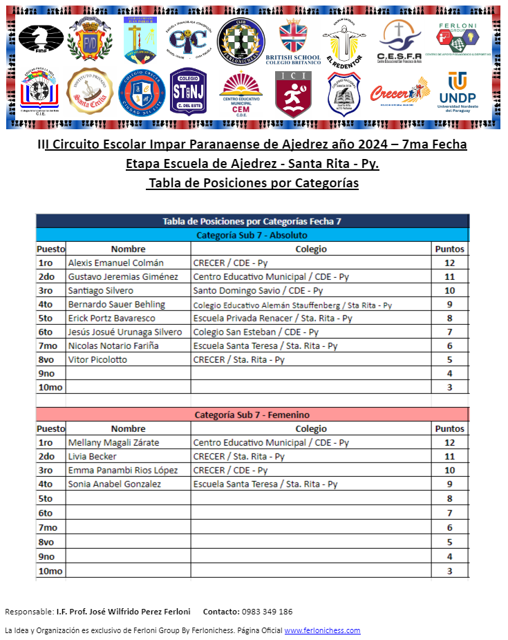 Tabla de Posiciones de Categorías y Colegios ​7ma Fecha