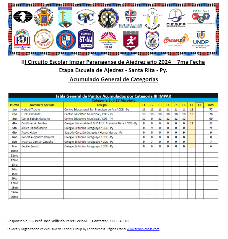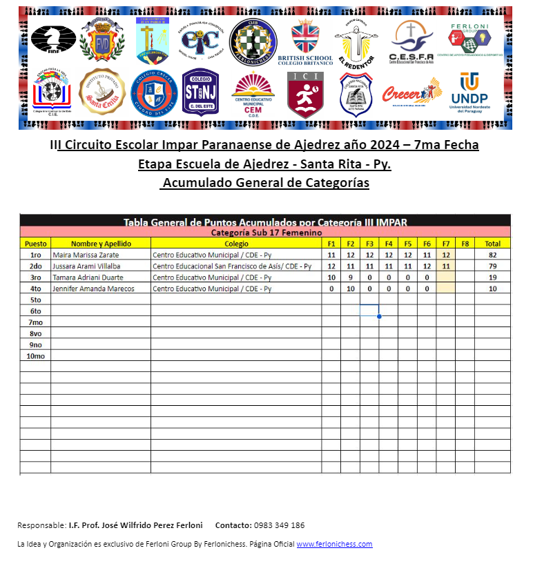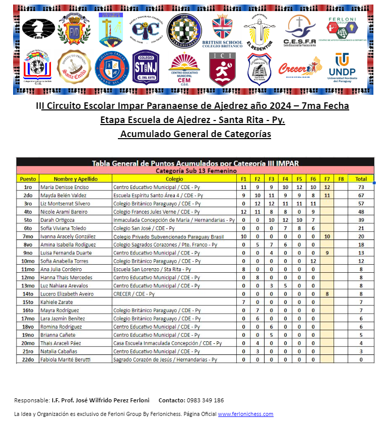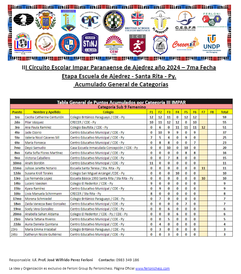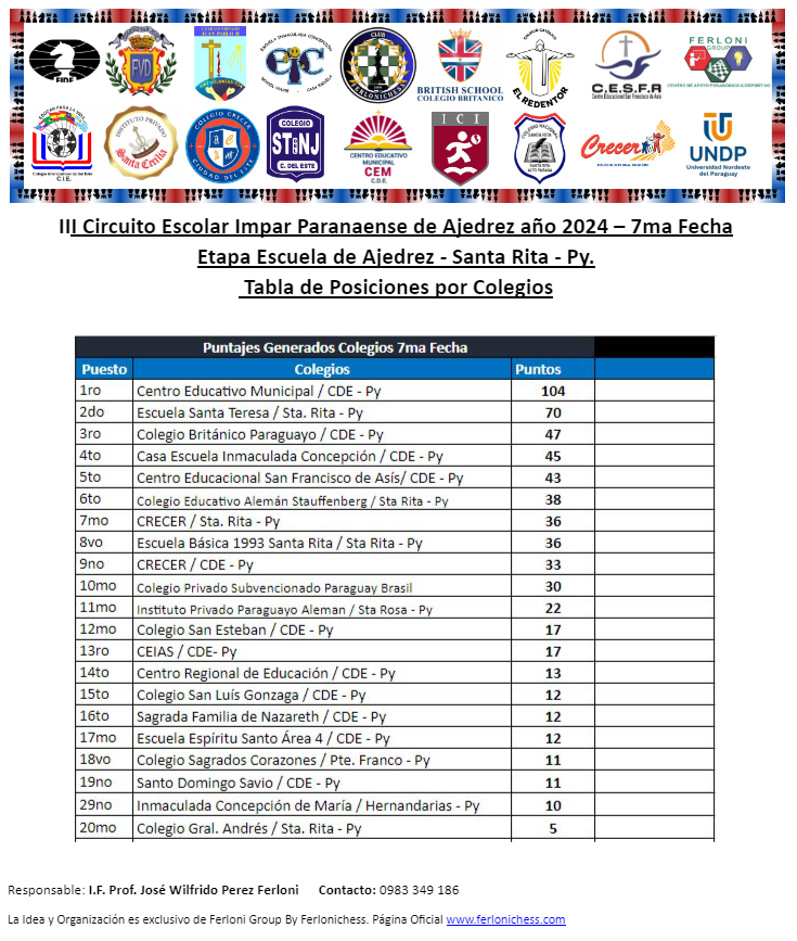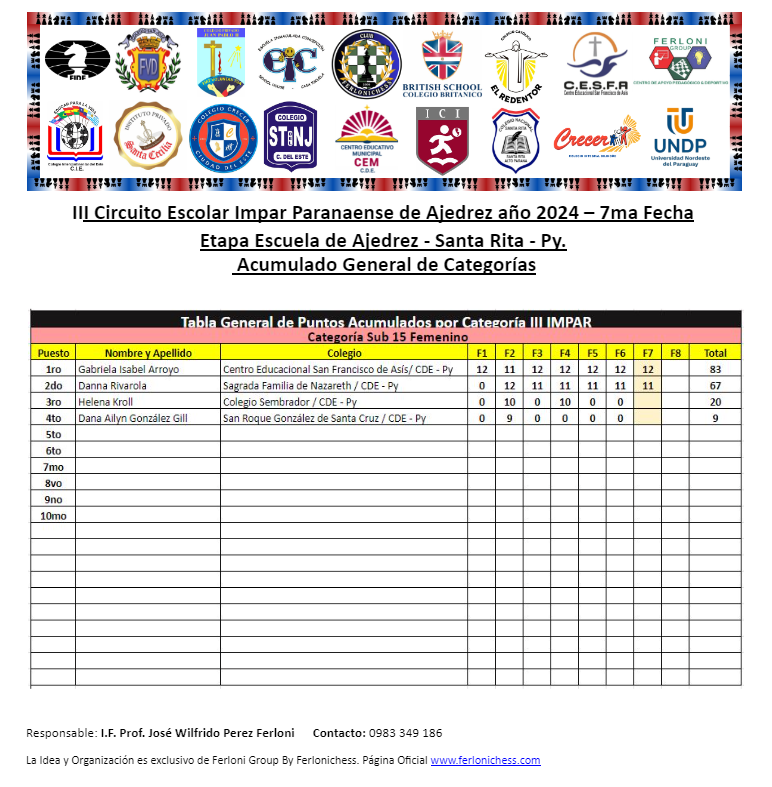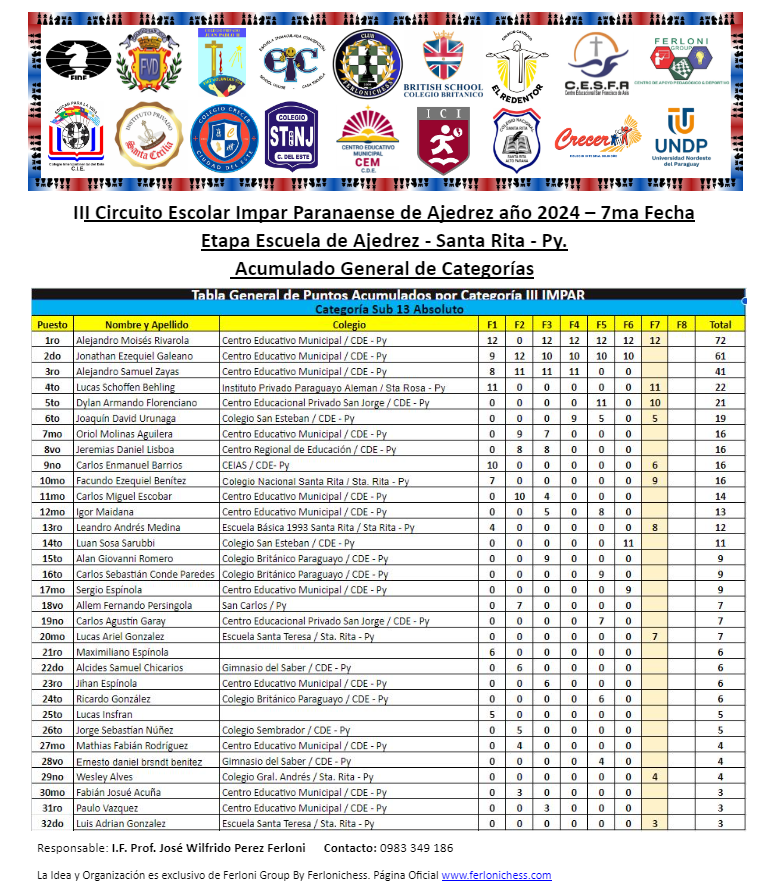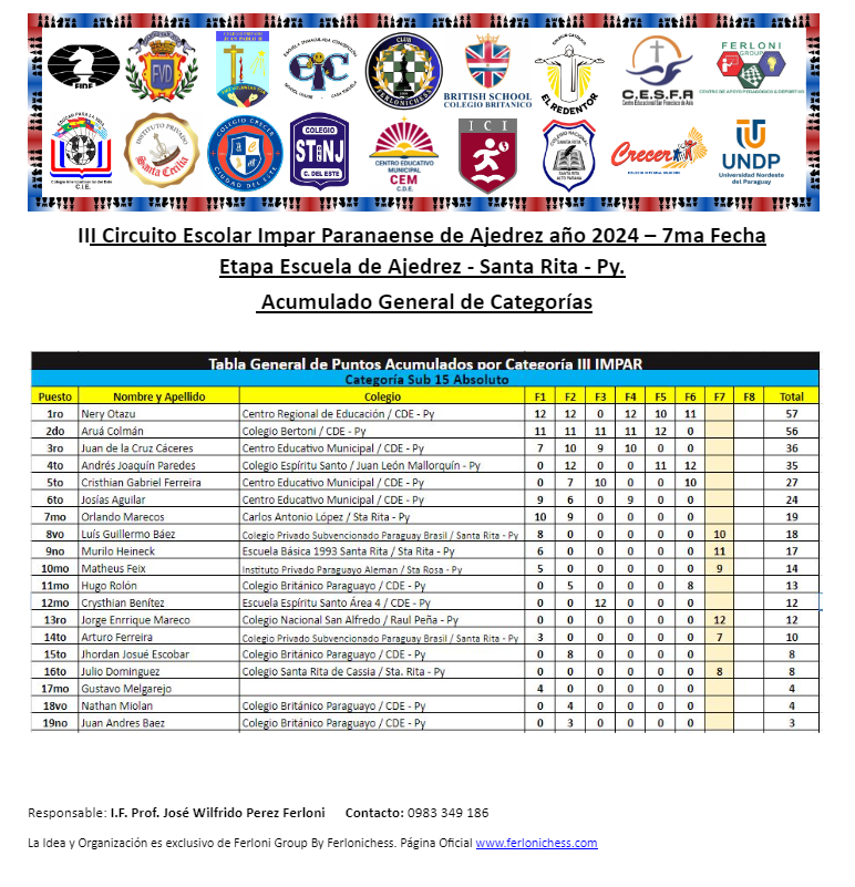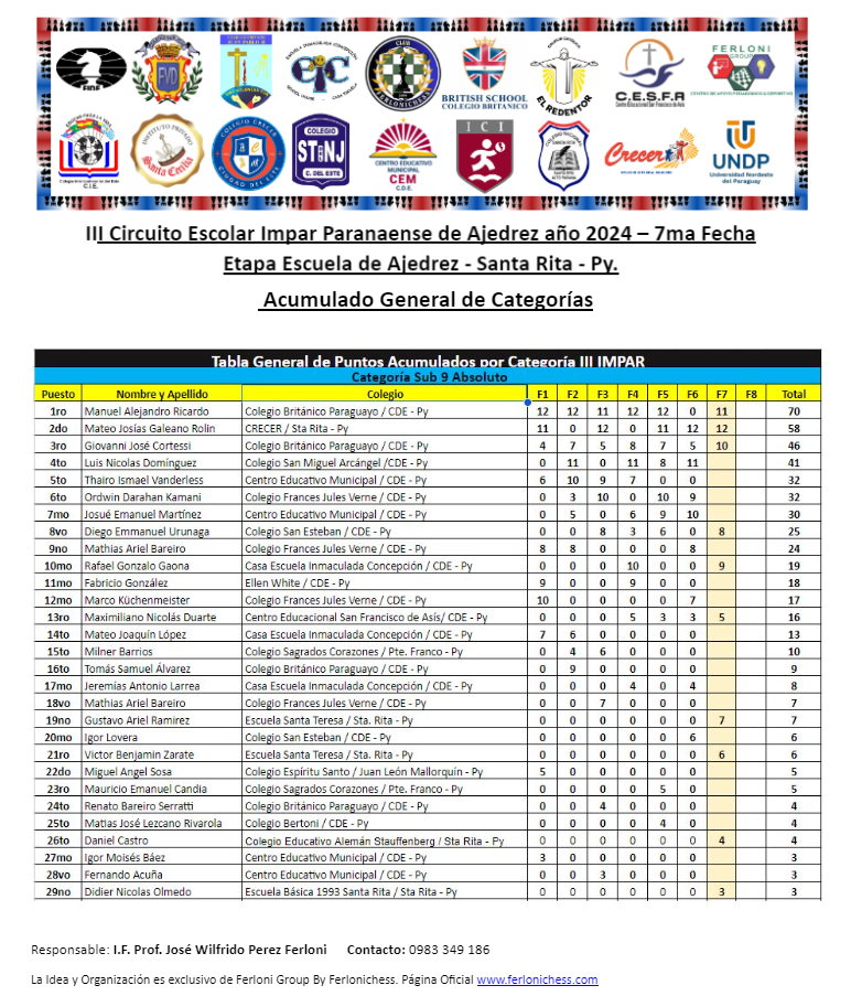 Tabla de Posiciones de Categorías y Colegios ​7ma Fecha